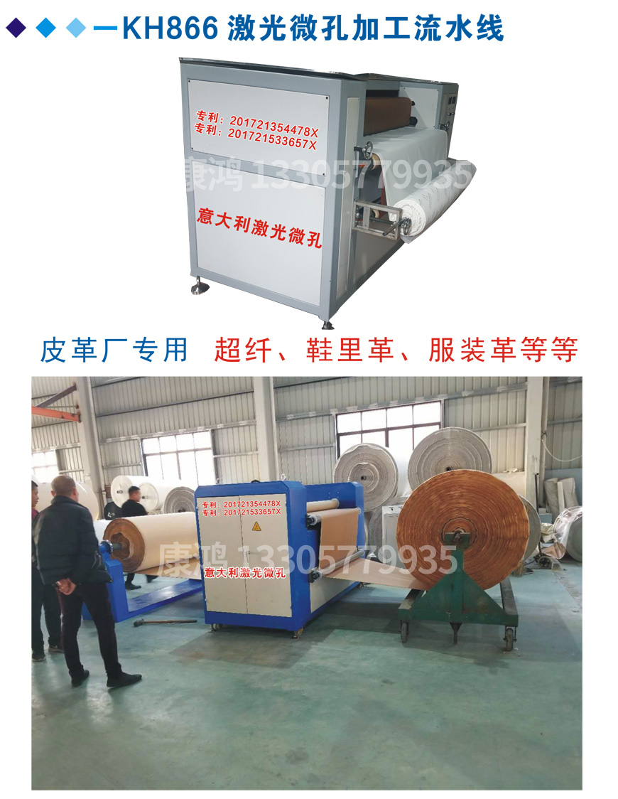 康鴻微孔技術可以保證在加工過程中零損耗;無任何廢棄物及污染。全方位克服了傳統化學透氣工藝中產生的環境污染、透氣性不穩定、耐刮性差、整體物理性能下降等嚴重缺點,大大提升了皮革及各類合成革的品質。(優點: 鞋子不臭腳、皮褲穿起更舒服達到真皮透氣效果)