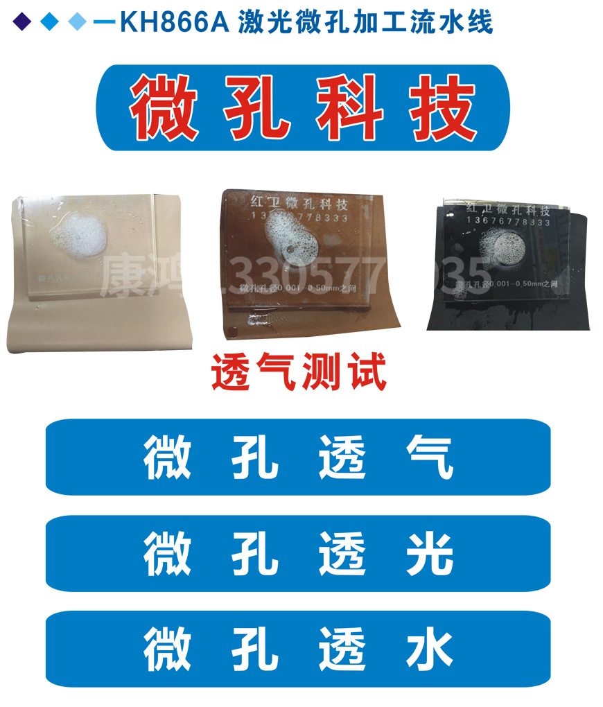 康鴻微孔技術在皮革、合成革制品及原材料的應用,在近些年經各方面科技人才不懈地努力和攻關下,目前已達到技術成熟;康鴻微孔技術運用激光結合的原理,再結合幾類稀有貴金屬作為導體的作用下研發而成。康鴻微孔技術目前專業針對皮革、合成革制品及原材料行業,經此技術加工后的皮革、合成革制品及原材料,可達到透光、透水、透氣等效果。康鴻微孔技術,目前使用于4MM以下的真皮二層、PU革、超纖革、太空革、移膜革、鞋里革等各類常用原材料。目前可根據不同需求,加工微孔孔徑0. 001MM-0. 50MM之間,可調微孔密度在每平方厘米20-100個孔之間。透氣度可達10%變化量之內。
